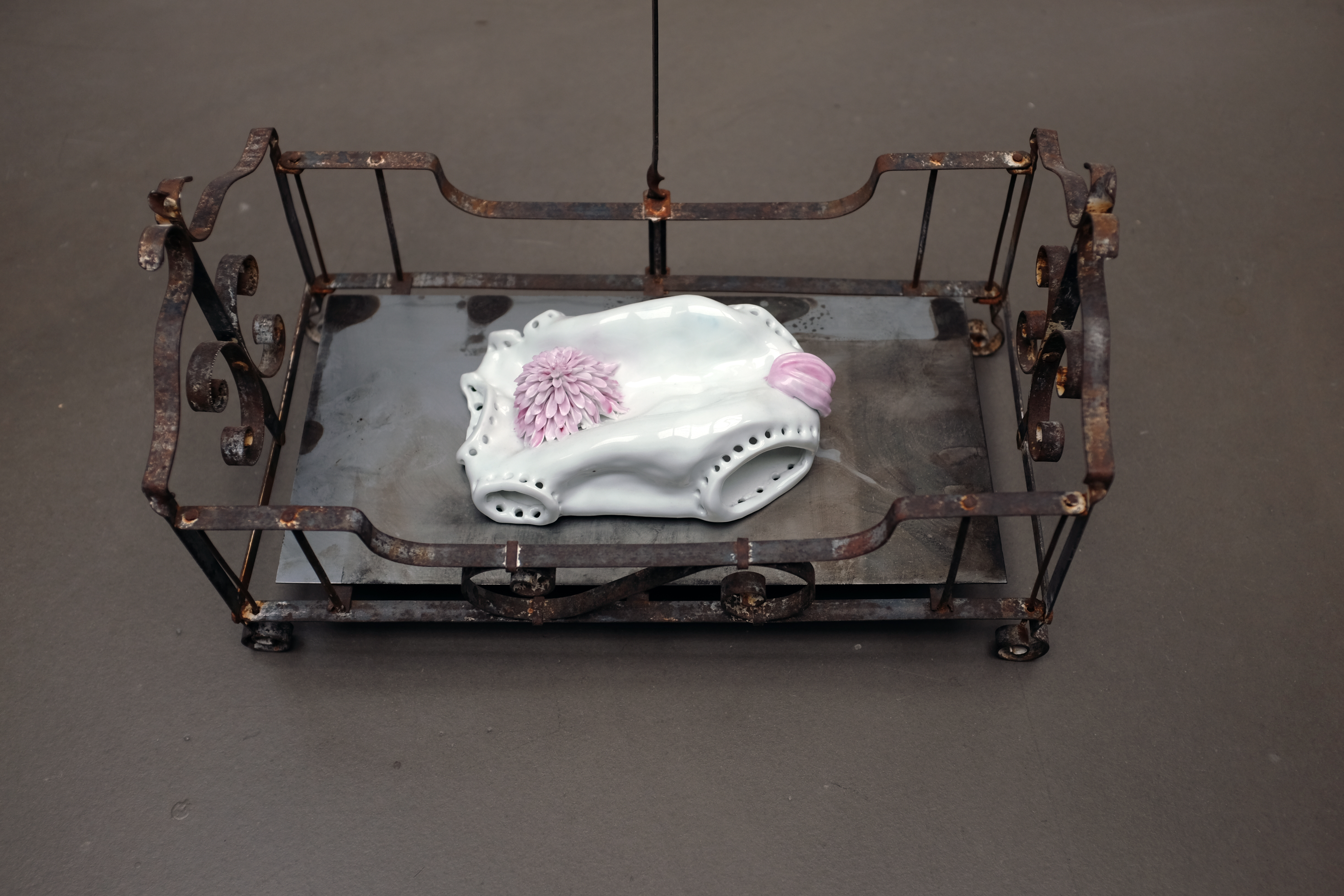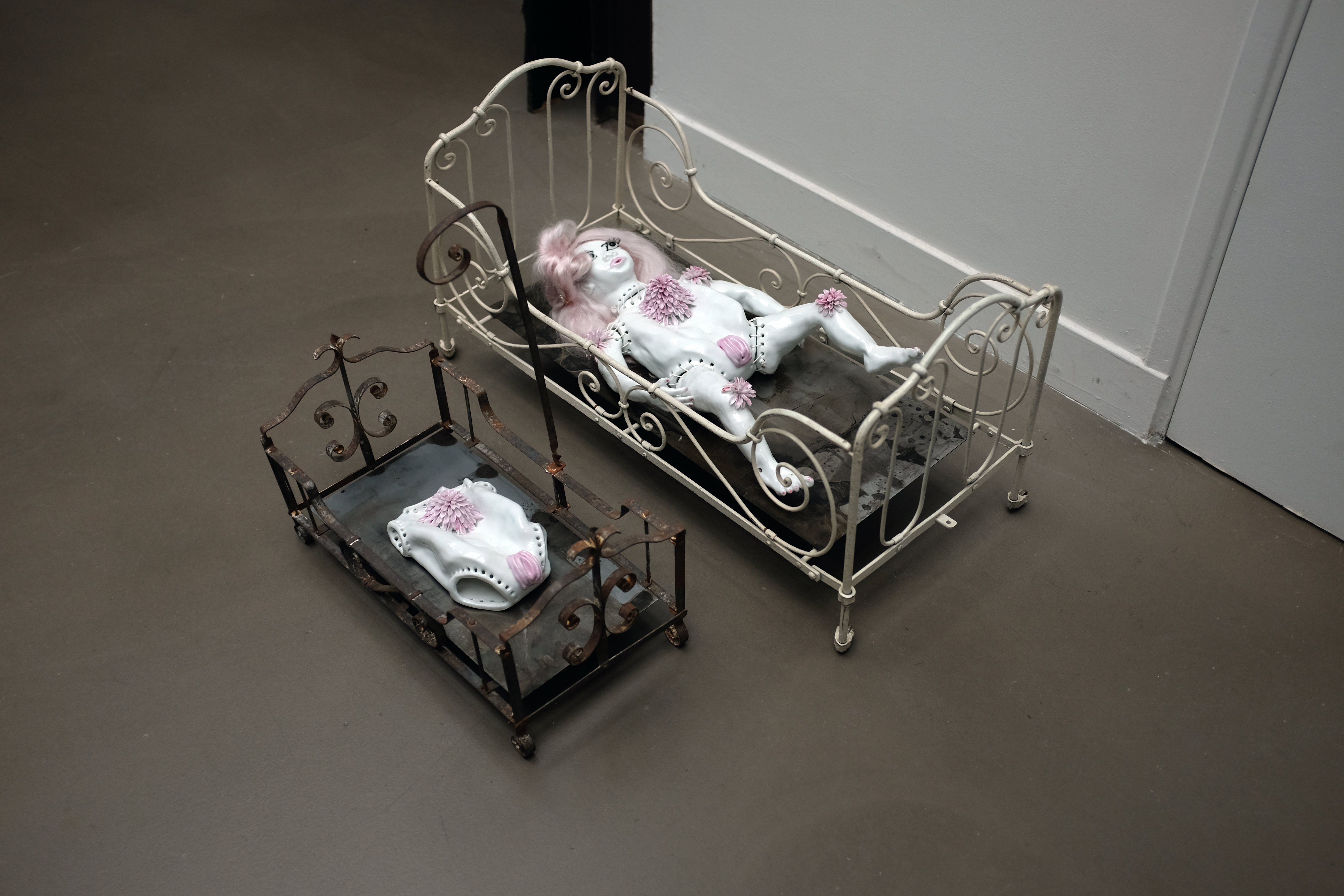 Porcelaine émaillée, cheveux, yeux de verre ancien. Lit métallique. /// Glazed porcelain, hair, glass eyes. Metallic bed.