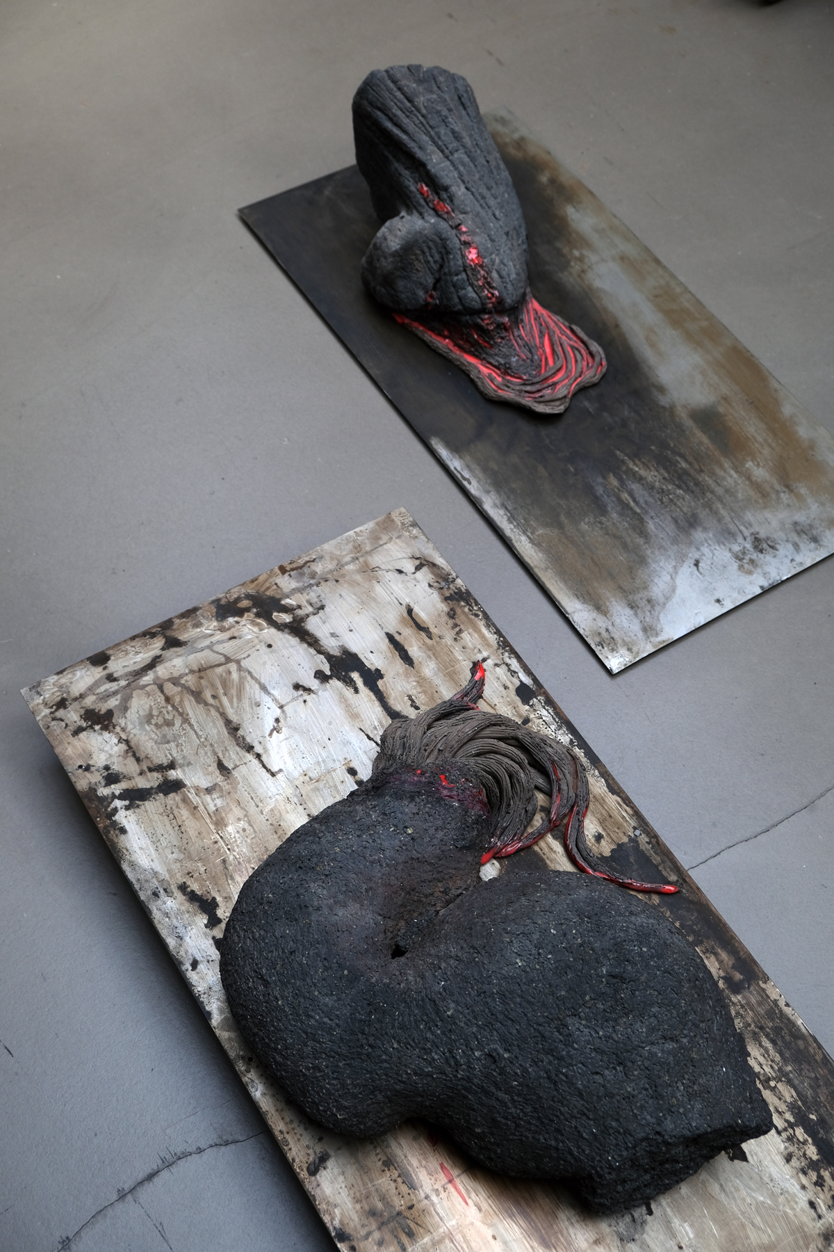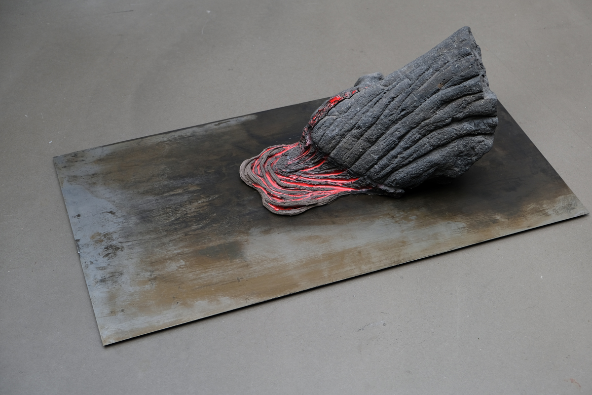Métaphore créatrice, en tant qu’artiste je suis un volcan en sommeil jusqu’à éruption. Processus organique de la matière céramique qui imite la nature dans le four avec une réaction chimique équivalente à celle de la chambre magmatique. Coulée de lave et coulée d’émail, matière en fusion et un esprit proche de l’implosion d’où naît une rose noire. Rose de lave, fleurir sur de la roche calcinée.