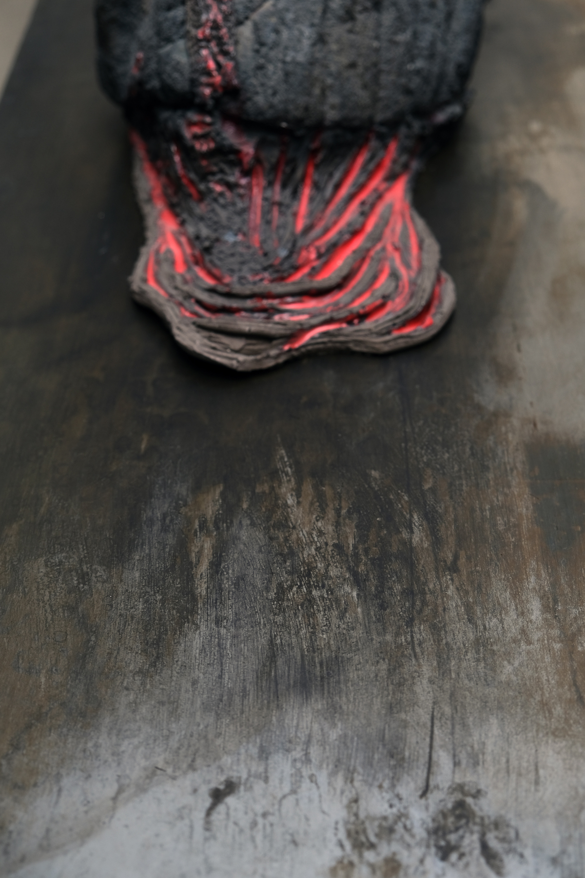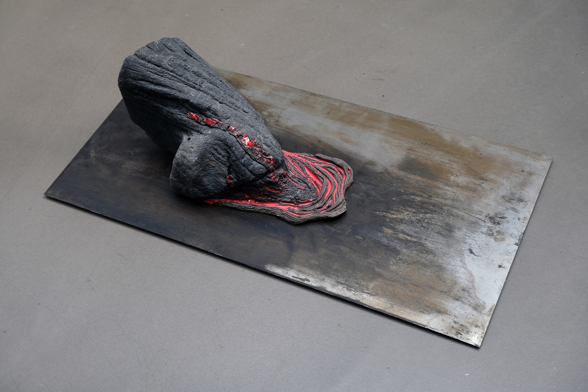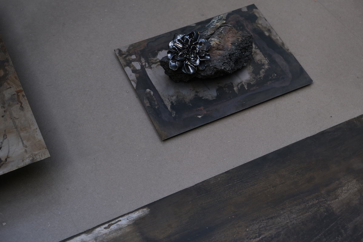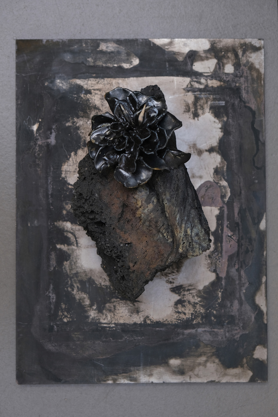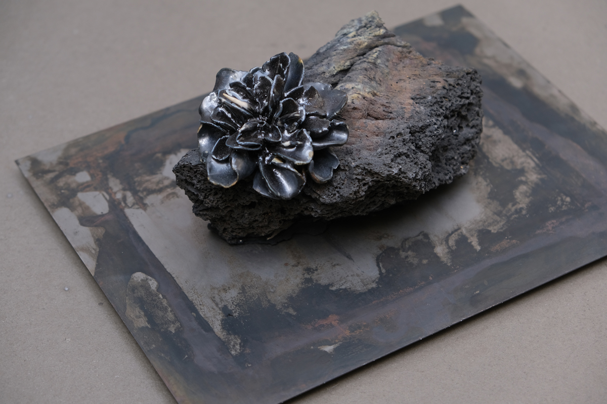 Creative metaphor, as an artist I am a dormant volcano until eruption. Organic process of ceramic material that imitates nature in the kiln with a chemical reaction equivalent to that of the magma chamber. Lava and enamel flow, molten matter and a spirit close to the implosion from which a black rose is born. Lava Rose: Blooms on calcined rock.