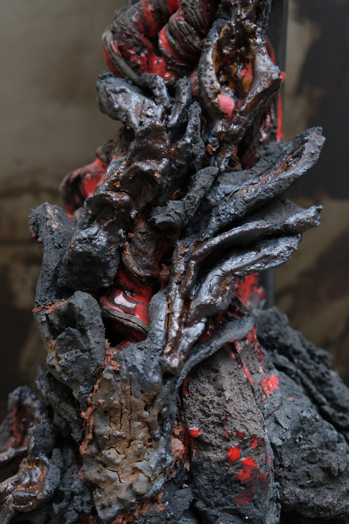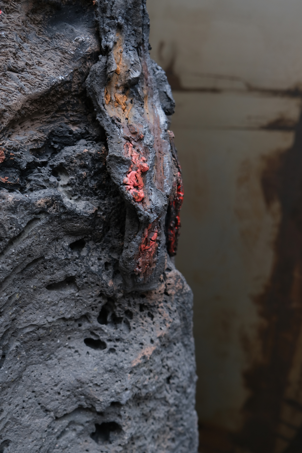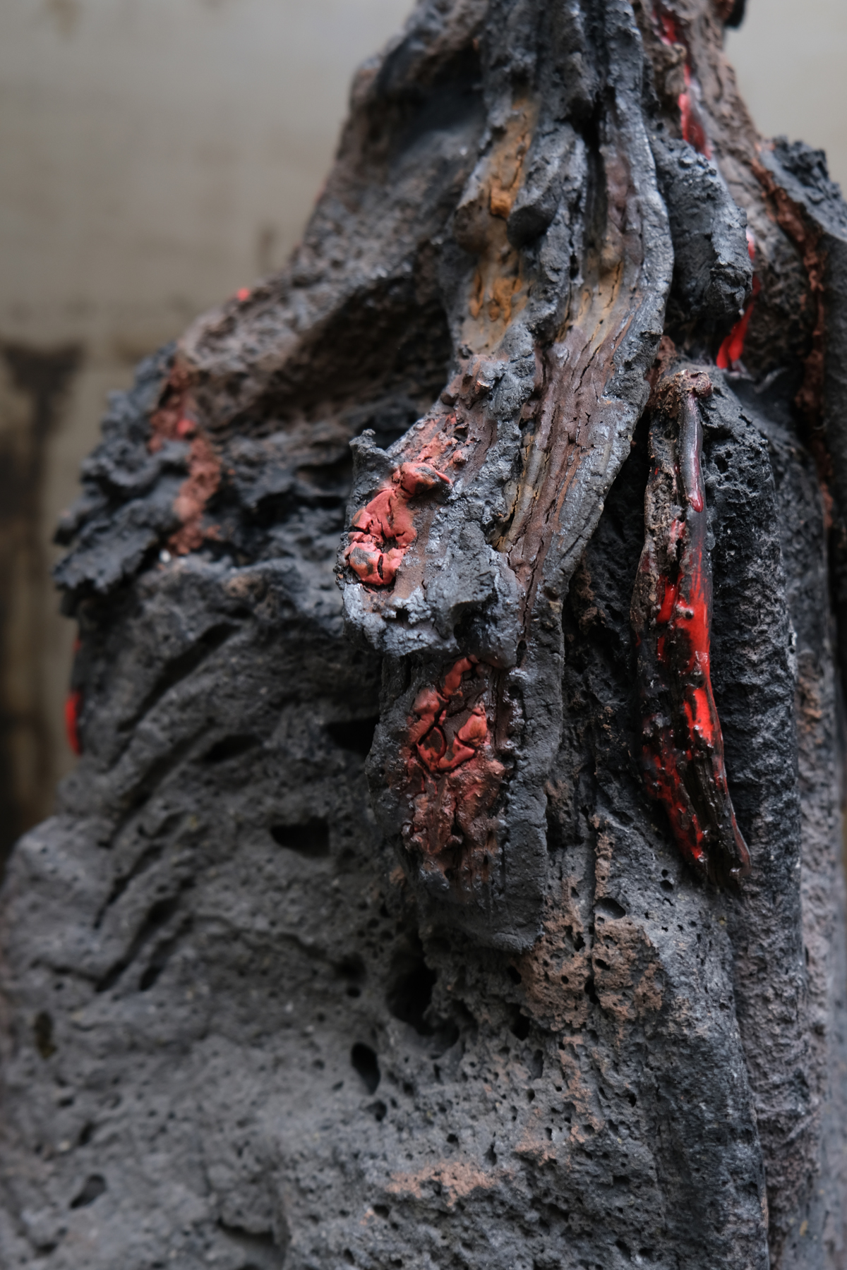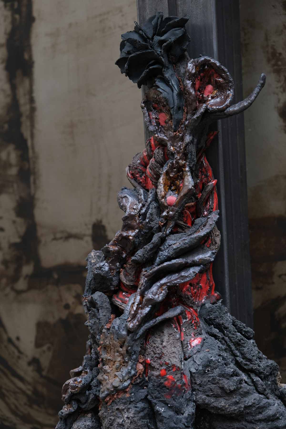Métaphore créatrice, en tant qu’artiste je suis un volcan en sommeil jusqu’à éruption. Processus organique de la matière céramique qui imite la nature dans le four avec une réaction chimique équivalente à celle de la chambre magmatique. Coulée de lave et coulée d’émail, matière en fusion et un esprit proche de l’implosion d’où naît une rose noire. Rose de lave, fleurir sur de la roche calcinée.