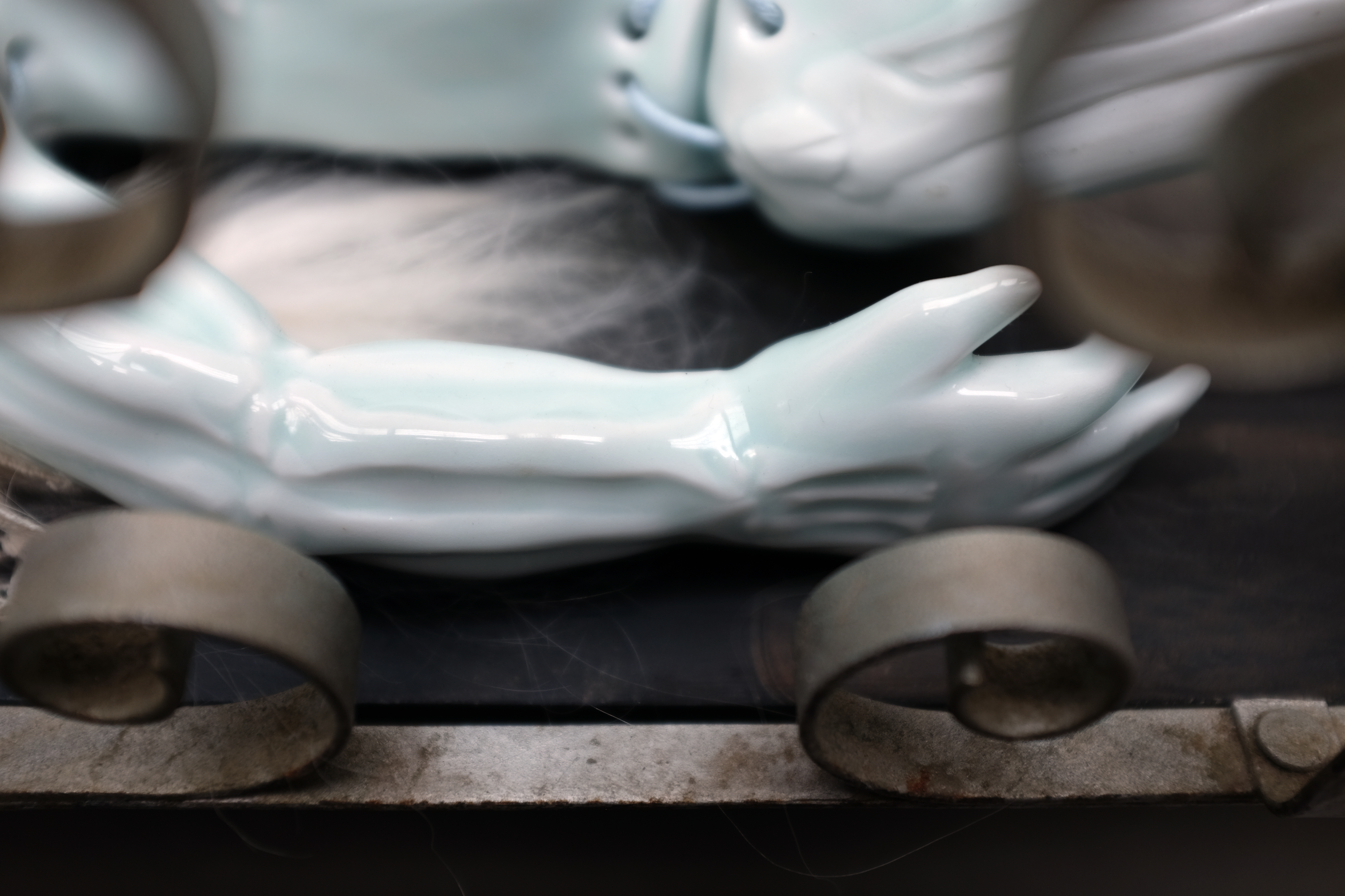 Porcelaine calligraphie oxydes & gravé émail céladon, cheveux,tissus, yeux de verre ancien. Lit métallique ancien. /// Calligraphic glazed porcelain, engraved light blue celadon, hair, glass eyes. Ancient metallic bed.