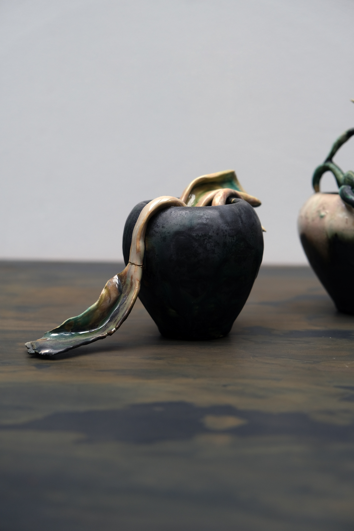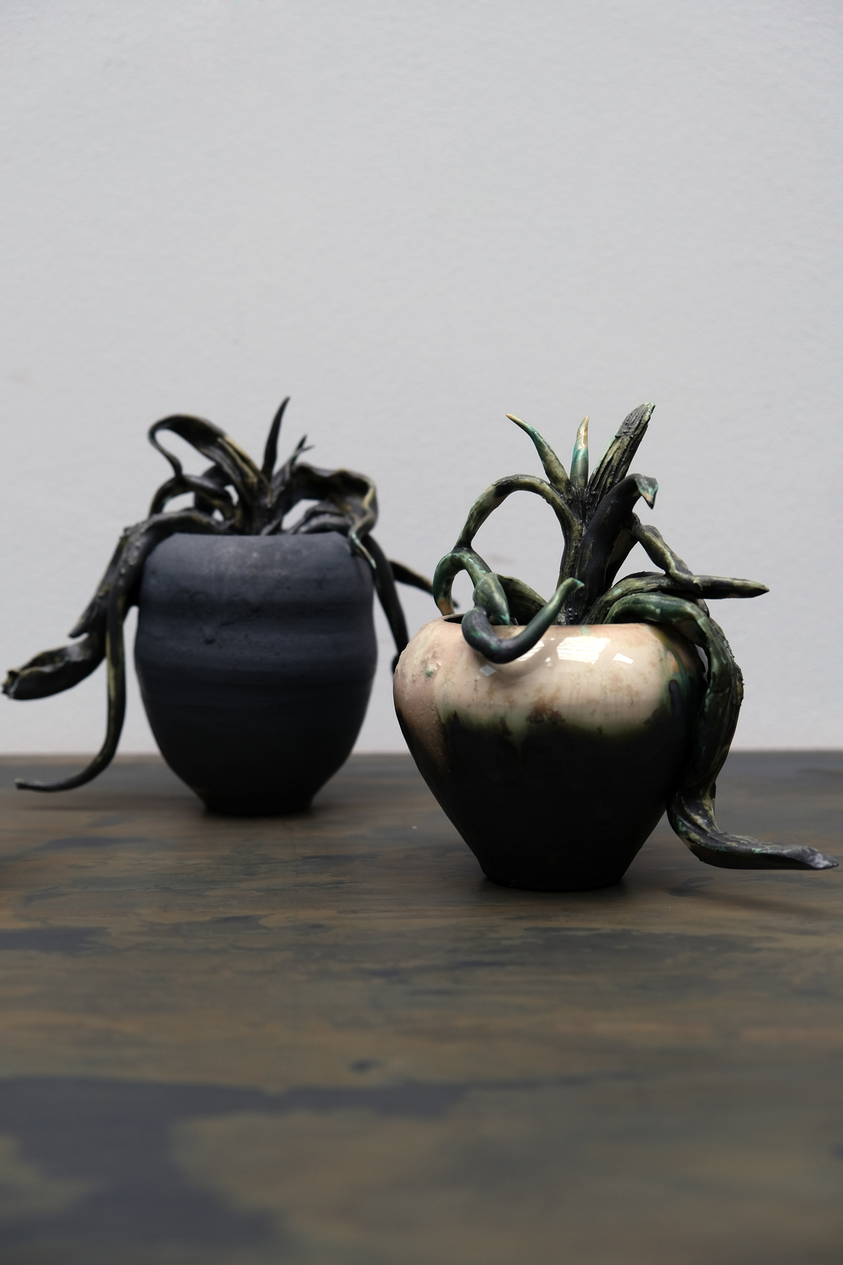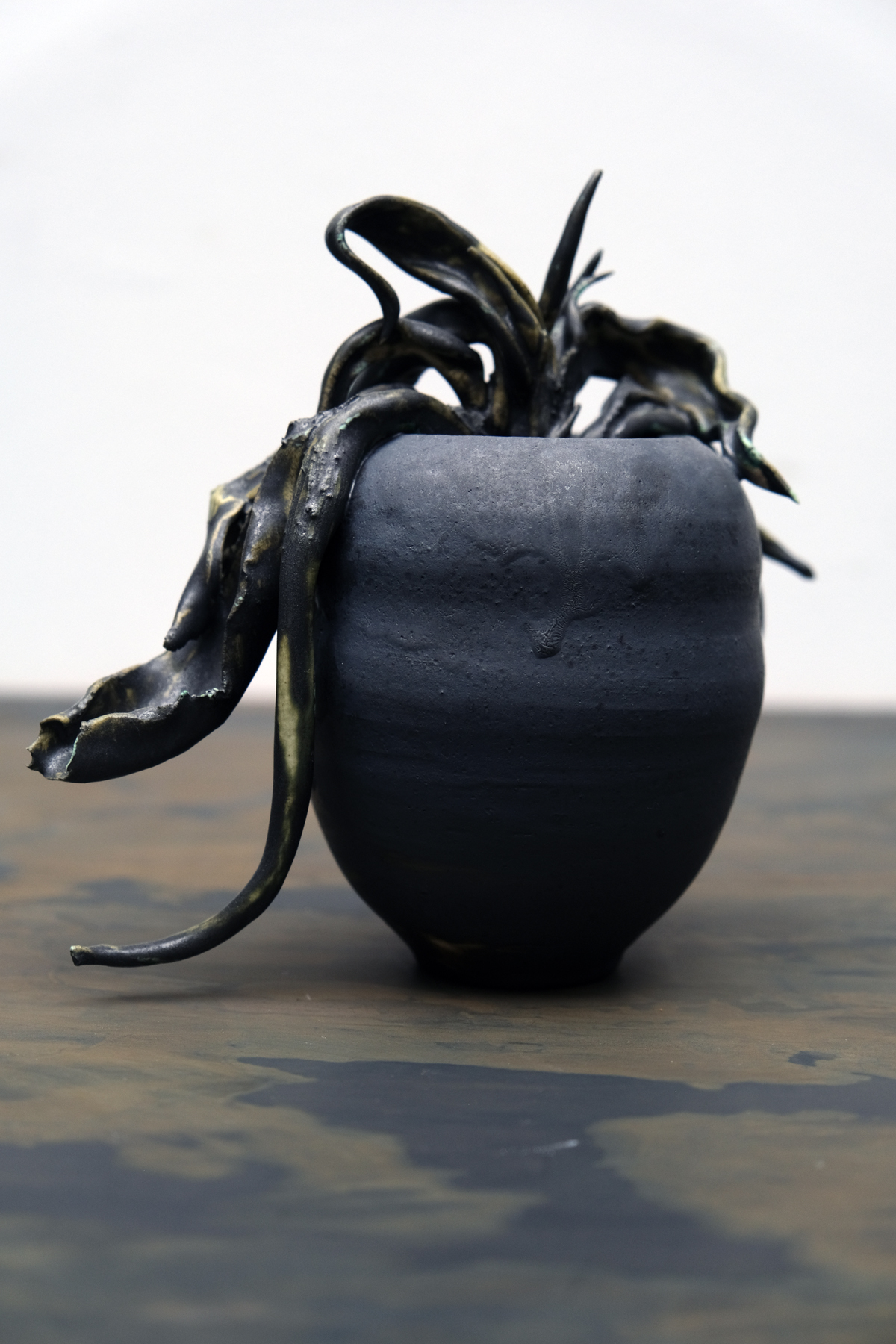 Porcelain vases with stoneware sculptural plants growing from the original throwed object. A metaphor of nature reclaining its rights over the hand made form by man.