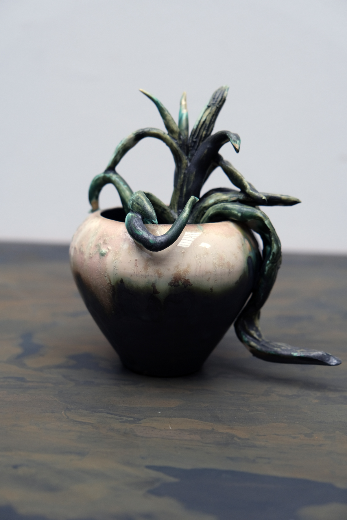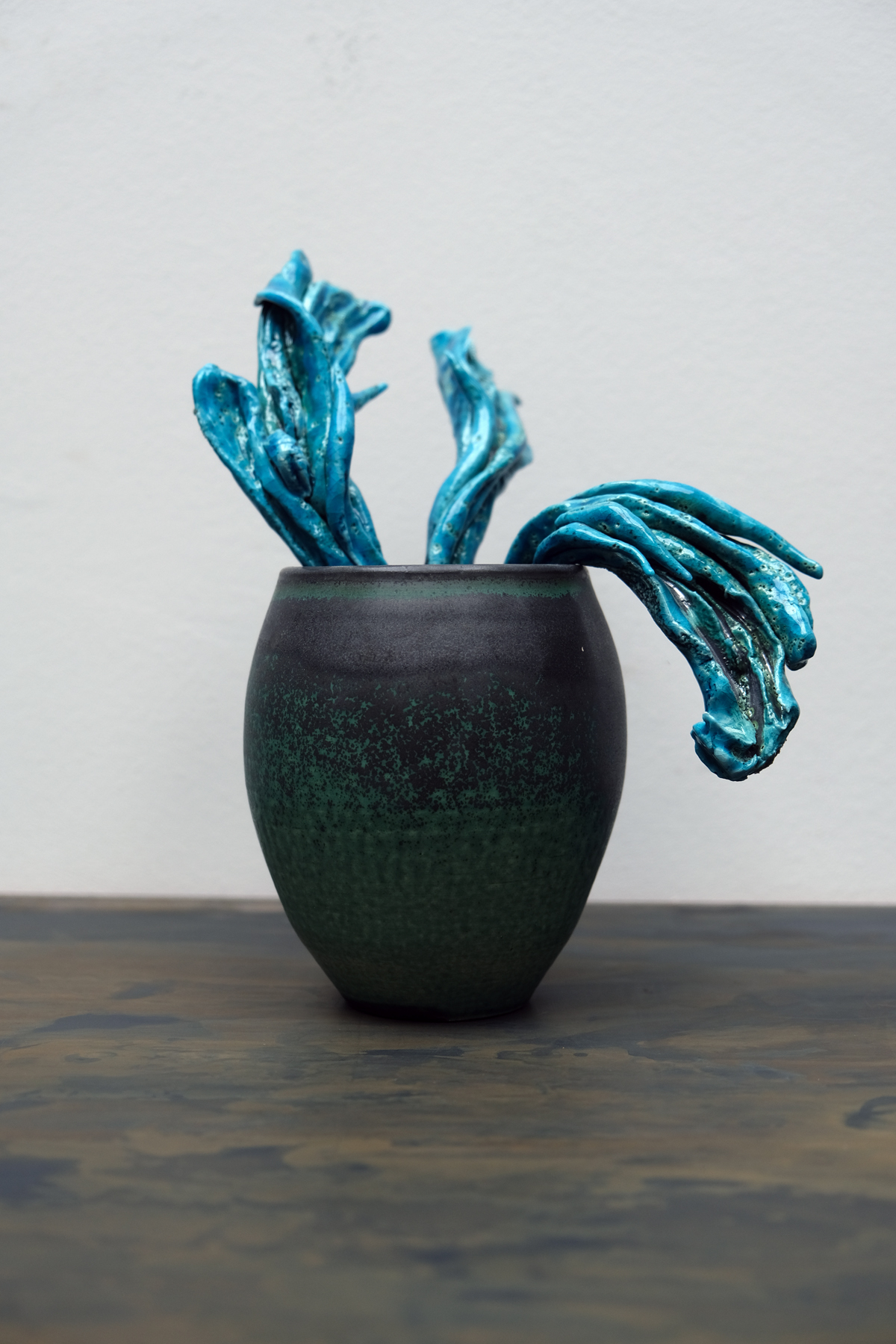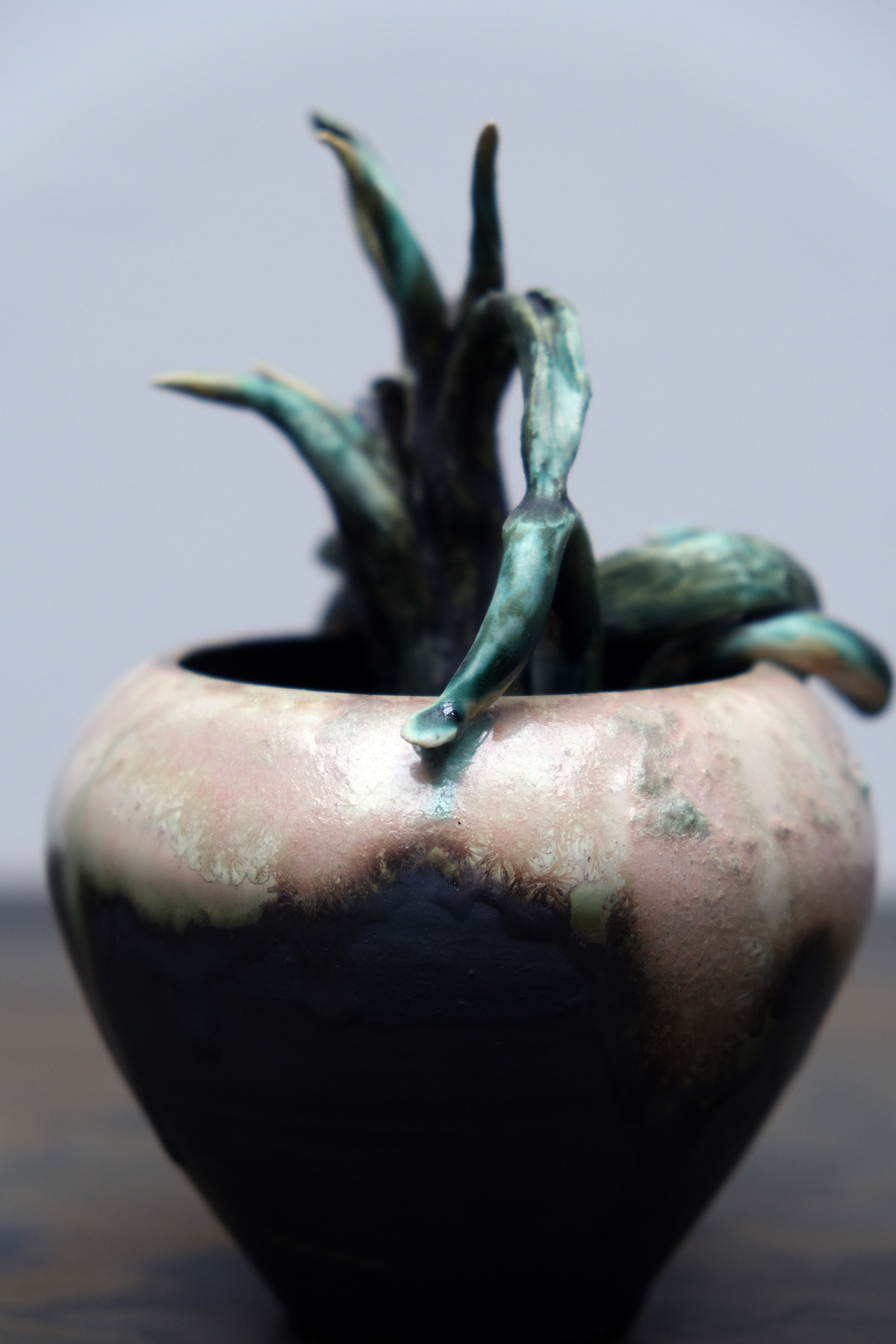 Vases de porcelaine, avec plante de grès porcelainé qui pousse de la forme tournée. Une métaphore de la nature qui reprend ses droits sur l’objet fabriqué par l’homme.