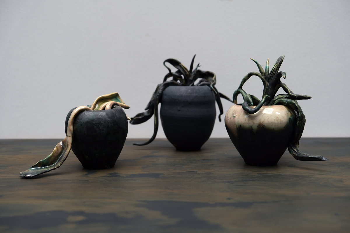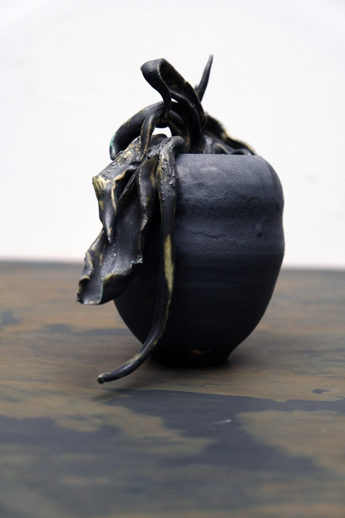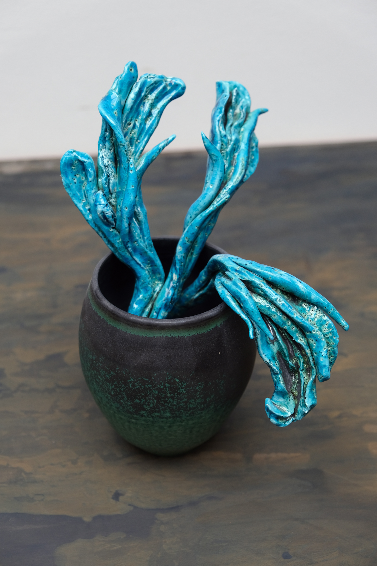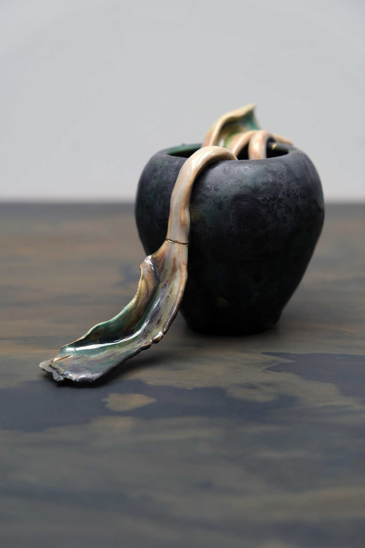 Vases de porcelaine, avec plante de grès porcelainé qui pousse de la forme tournée. Une métaphore de la nature qui reprend ses droits sur l’objet fabriqué par l’homme.