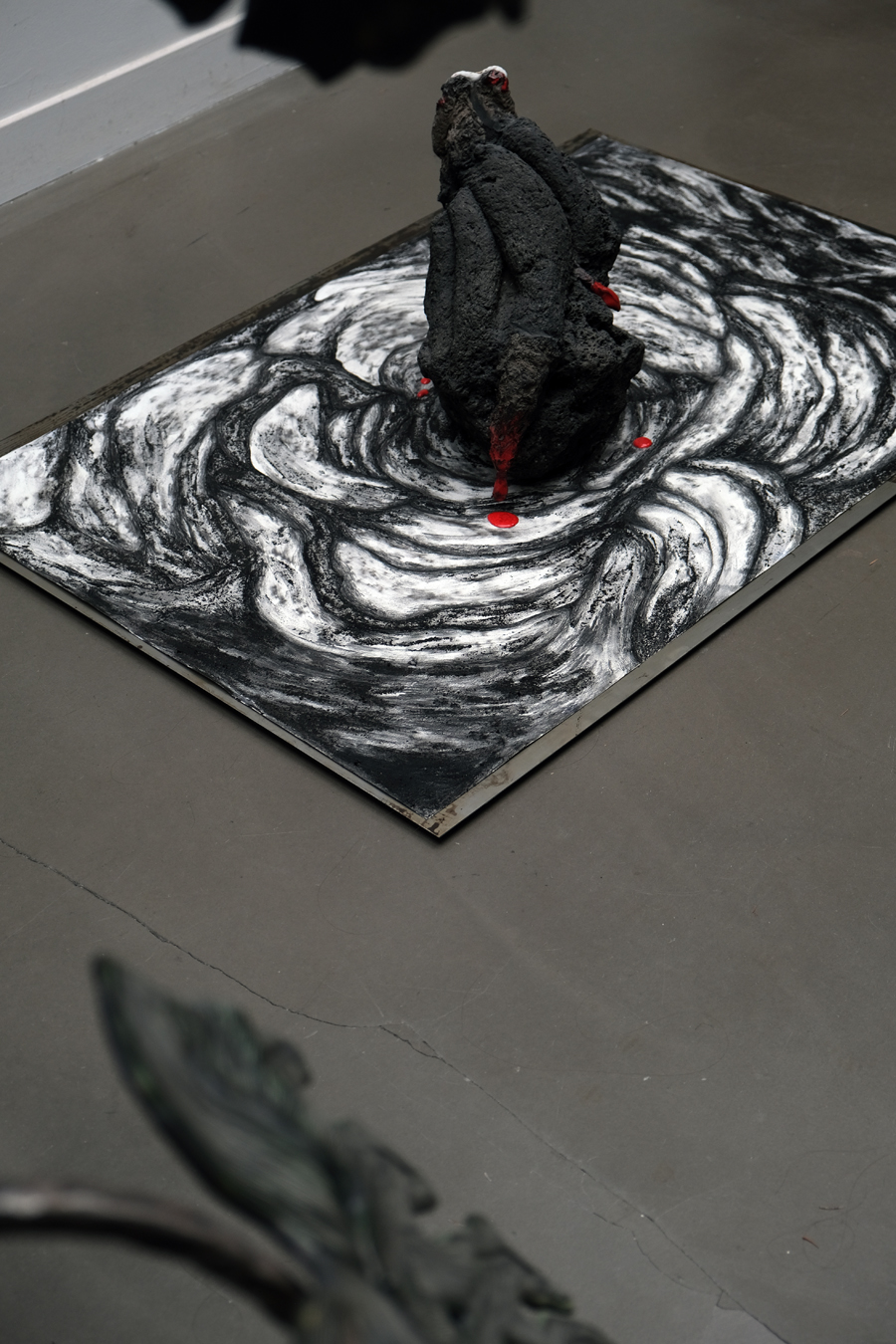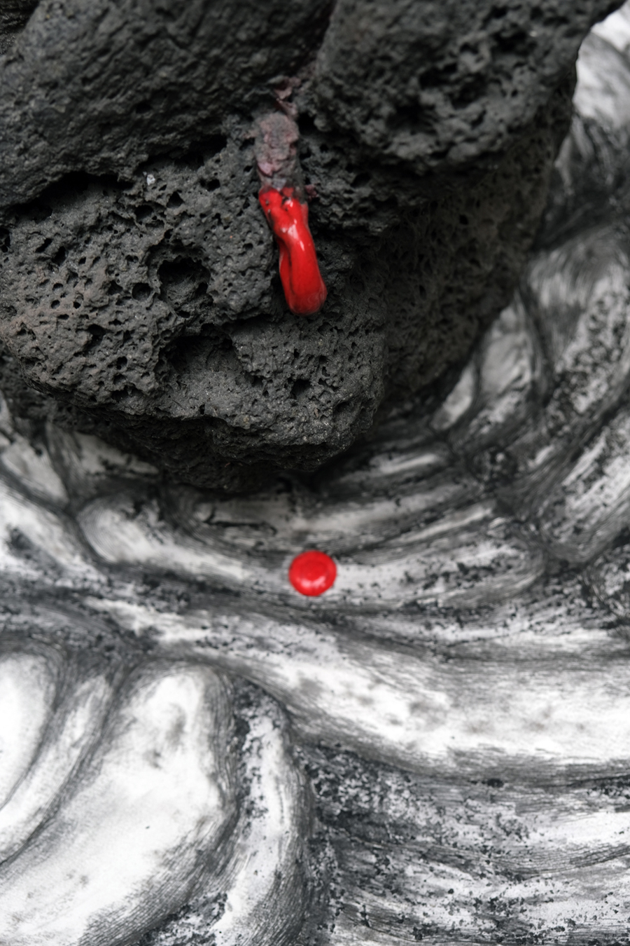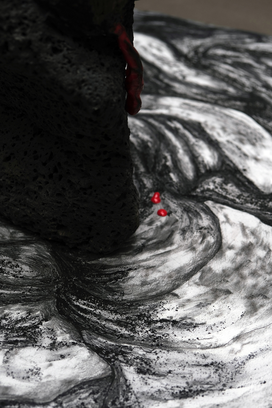 Ceramique émaillé sur roche volcanique, support métallique et dessin fusain et matière mixte / Glazed ceramics on volcanic rock, metallic support with charcoal and mixt drawing techniques .