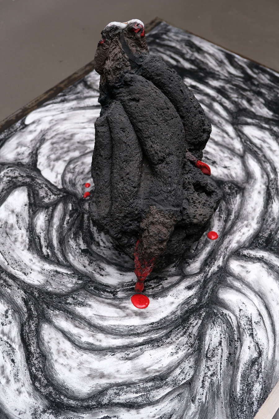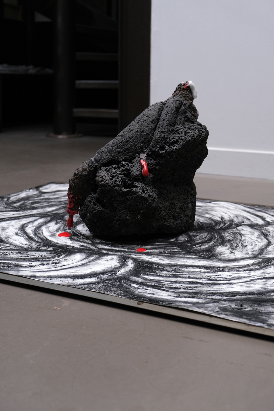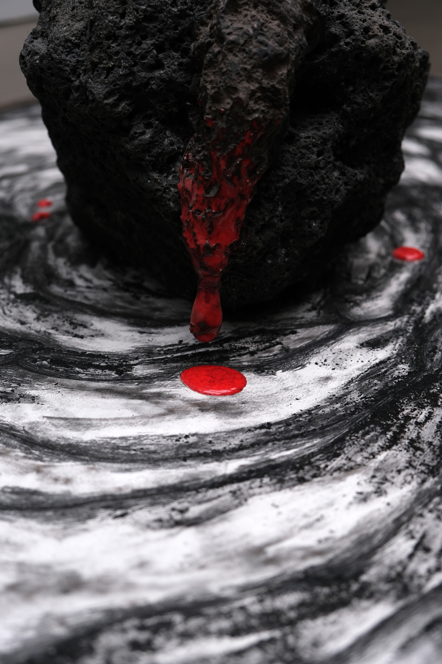 Ceramique émaillé sur roche volcanique, support métallique et dessin fusain et matière mixte / Glazed ceramics on volcanic rock, metallic support with charcoal and mixt drawing techniques .