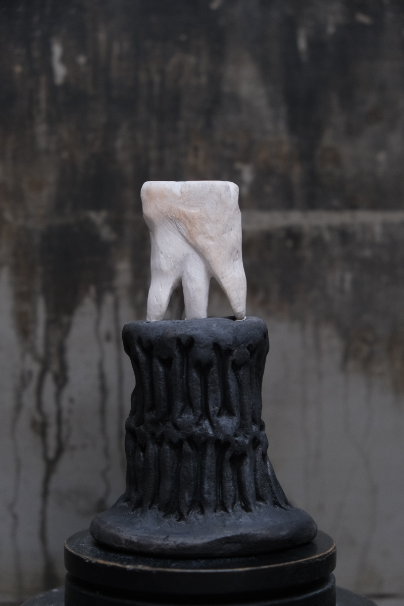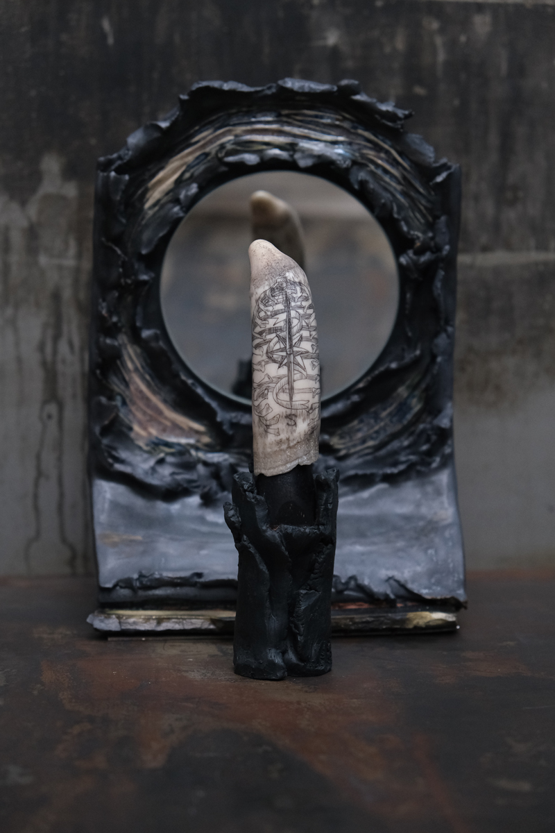 Sculptures and engravings of whale bones and teeth, created in the Azores archipelago from relics dating back to the 1970s, using ancient votive techniques employed by sailors and complemented by ceramic supports in the spirit of transcultural cabinets of curiosities. The theme of the young girl and death, a maritime memento mori.